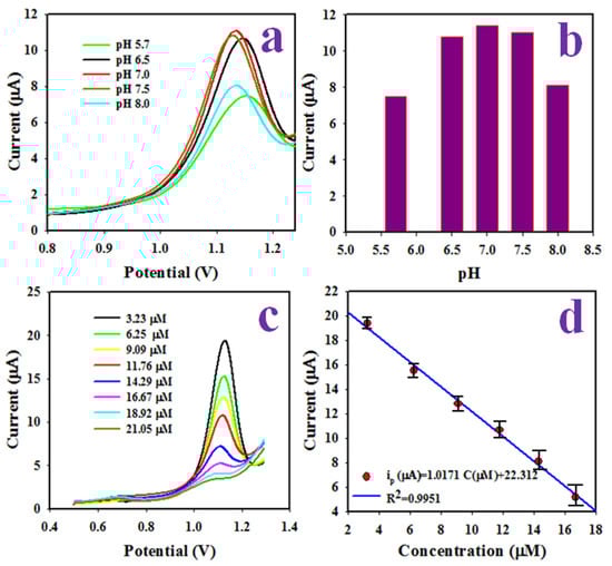 Figure 6. Analysis of sensor performance for the detection of target analyte. (a) The pH effects on the DPV analysis of 2,6-DNP, (b) the bar diagram of pH effect in electrochemical analysis of 2,6-DNP, (c) the DPV analysis of 2,6-DNP in pH 7.0 based on the concentration variation from low to high, and (d) the calibration of 2,6-DNP sensors.