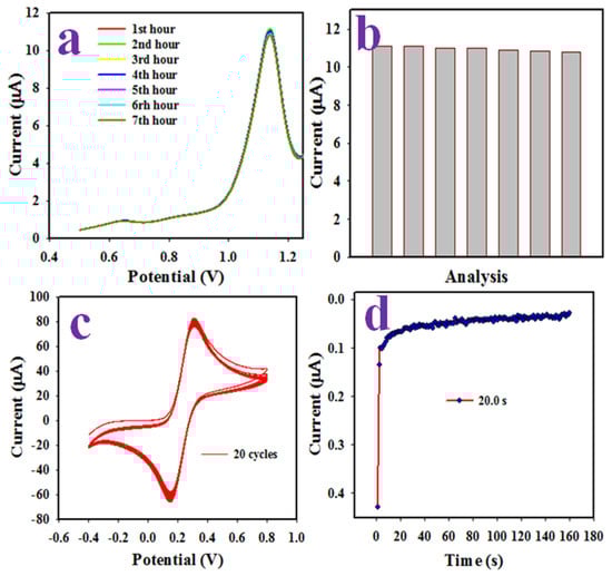 The steadiness of 2,6-DNP DPV sensor in the performance is necessary to establish the reliability of this method. The analyzed results with repeating values is known as reproducibility and this test was performed with PbO-doped ZnO MSs/GCE sensor using 9.09 µM concentration of 2,6-DNP in buffer medium of pH 7 shown in Figure 7a,b and this experiments were conducted in the consecutive seven hours. As perceived, the seven replicated analyzed data points are undistinguished and not possible to identify separately. Therefore, the outcomes of this test convey the information regarding the reliability of 2,6-DNP sensor. The sensor-performing stability for longer duration is important for this study. This stability test of this 2,6-DNP sensor was executed by analyzing 0.1 mM solution of Fe(CN)63−/4− in pH 7 buffer applying cyclic voltametric electrochemical approach at 20 cycles as illustrated in Figure 7c and resultant outcome confirms the long-term stability of 2,6-DNP in buffer phase. The performing efficiency of the sensor is calculated by response time, and this performance was tested at 9.09 µM 2,6-DNP as shown in Figure 7d. The resulting 20 s response time of the 2,6-DNP sensor is confirmed to have good efficiency.