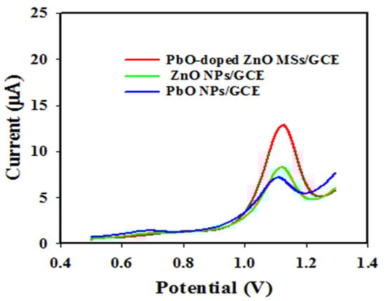 A controlled experiment was executed with GCE modified by PbO-doped ZnO MSs, ZnO NPs and PbO NPs in differential pulse voltametric analysis of 2,6-DNP (9.09 µM) perceived in Figure 8 with identical conditions. It is shown that PbO-doped ZnO MSs/GCE electrodes are performed and exhibited the highest peak current at potential +1.10 V compared with their single oxide. This happened for the large reactive surface-area of binary oxides as well as higher conductivity (higher electrochemical activity) compared to their single oxides (ZnO and PbO). As it is shown in Figure 3d, the elemental analysis of prepared MSs is consist of around 10% Pb (wt%), whereas the dominating element is Zn with 63% (wt%). Therefore, it can be assumed that PbO is doped into the dominating ZnO. As known, the reactive surface area is increased due to doping in nanomaterials. Therefore, the surface area of PbO-doped ZnO MSs is higher that the pure ZnO. As shown in Figure 8, the reduction peak current of 2,6-DNP has little higher for pure ZnO compared to pure PbO modified GCE. When, ZnO is doped with PbO (around 10%), its reactivity is increased very high. Thus, it can be concluded that doping is increased the reactive surface area of ZnO. PbO-doped ZnO MSs material offers improved performance due to the large-active surface area which increased of conductivity and current responses of PbO-doped ZnO MSs/Nafion/GCE assembly during electrochemical investigation. This fabricated doped PbO-doped ZnO MSs/Nafion/GCE is very active and electro-oxidized the 2,6-DNP in respect of current against applied potential compared with other chemicals. Therefore, PbO doped-ZnO MS has exhibited the highest electrochemical performance compared with the undoped counterpart.
