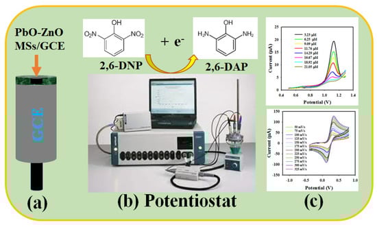 Generally, ZnO and PbO are well-known as sensing substrates individually for the development of sensor. As a gas sensor, ZnO as single/composites has been reported to sense ethanol [21], oxygen [22], H2S [23], NO2 [24], CO [25], and NH3 [26], respectively. ZnO is an n-type semi-conductive metal-oxide with direct and wider optical bandgap and having the unique piezo-electric characteristic. These physio-electrochemical properties of ZnO are well suited as electrons sensing substrates to develop the electrochemical sensors of various bio-chemicals and chemicals [27,28,29,30,31,32], as reported previously. On the other hand, the PbO has wider optical bandgap and attractive electro-chemical properties and used potentially to develop of sensors such as humidity [33], ethanol [34], and methanol [35]. Therefore, ZnO and PbO have already applied as sensing substrates separately to the development of sensors. On the other hand, the synergic electro-catalytic characteristic of individual metal oxide in the binary nanocomposites can be promoted in the detection performance of analytes [36]. Here, PbO-doped ZnO MSs have employed a great deal of consideration owing to their chemical, structural, physical, and optical properties in terms of large-active surface area, high-stability, high porosity, high activity, and permeability, which directly dependent on the structural morphology prepared by reactant precursors in these doped materials in basic medium at low-temperature. Here, the MS materials were wet-chemically synthesized by using reducing agents at ambient conditions. This technique has several advantages including facile preparation, accurate control of the reactant temperature, easy to handle, one-step reaction, and high surface area as well as high porosity. Optical, morphological, electrical, and chemical properties of PbO-doped ZnO MSs are of huge significance from the scientific aspect, compared to their undoped counter parts. Non-stoichiometry, mostly oxygen vacancies, conduct nature in the doped nanostructure materials. The formation energy of oxygen vacancies and metal interstitials in the semiconductor is very low, and thus these defects form eagerly, resulting in the experimentally elevated conductivity of PbO-doped ZnO MS materials compared to other PbO and ZnO nanomaterials. PbO-doped ZnO MSs have also attracted considerable interest due to their potential applications in fabricating opto-electronics, electro-analytical, selective detection of assays, sensor devices, hybrid-composites, electron-field emission sources for emission exhibits, biochemical detections, and surface-enhanced Raman properties, etc. PbO-doped ZnO MSs material offers improved performance due to the large-active surface area which increased conductivity and current responses of PbO-doped ZnO MSs/Nafion/GCE assembly during electrochemical investigation. This fabricated doped PbO-doped ZnO MSs/Nafion/GCE is very active and electro-oxidized the 2,6-DNP in respect of current against applied potential compared to other chemicals. In addition, the doped nanomaterials have lower optical band-gap energy and higher reactive surface area compared to the single metal oxides, which might be influenced by the electrochemical sensing performances [37,38,39].For this reason, PbO-doped ZnO MSs have been prepared applying the wet-chemical method to enhance the electrochemical sensing of target 2,6-DNP in phosphate-buffered solution.