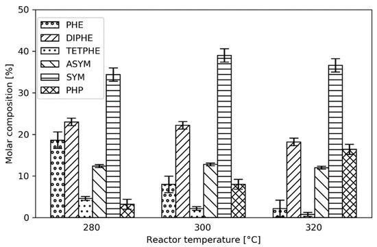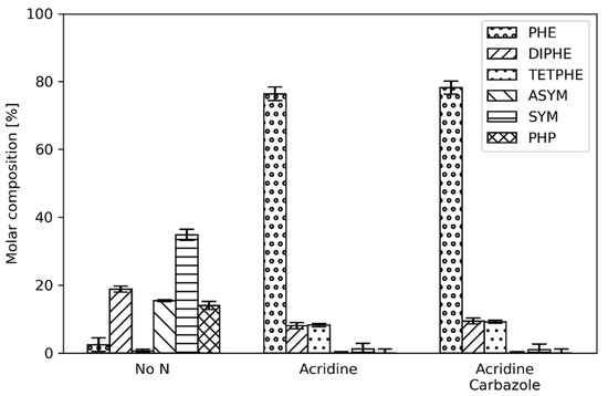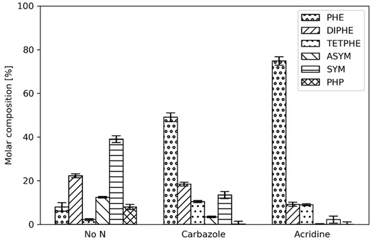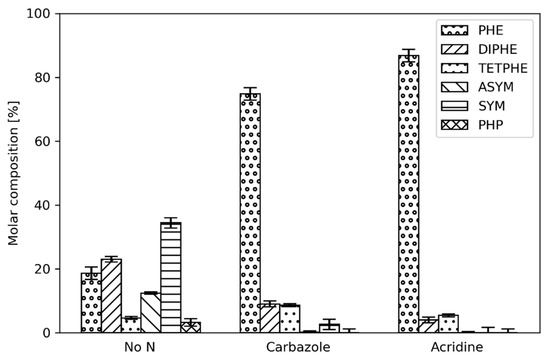 At 320 °C the organonitrogen addition still affects the PACs hydrogenation and the product distribution (Figure 5), however, it is not as severe as it is at lower temperatures. This is especially true for carbazole, where SYM becomes the most abundant product compared to phenanthrene, which predominates at 300 °C. Additionally, the yield of PHP is increased. More importantly, the effect of acridine is not as pronounced compared to the lower reactor temperatures. While phenanthrene is still the most abundant constituent in the liquid outlet, the yield of the hydrogenation products is increased.