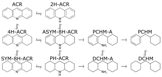 HDN network of acridine to its HDN products: 9,10-dihydroacridine (2H-ACR), 1,2,3,4-tetrahydroacridine(4H-ACR), 1,2,3,4,4a,9,9a,10-octahydroacridine (ASYM-8H-ACR), 1,2,3,4,5,6,7,8-octahydroacridine (SYM-8A-ACR), perhydroacridine (PH-ACR), phenylcyclohexylmethaneamine (PCHM-A), dicyclohexylmethaneamine (DCHM-A), phenylcyclohexylmethane (PCHM), and dicyclohexylmethane (DCHM).