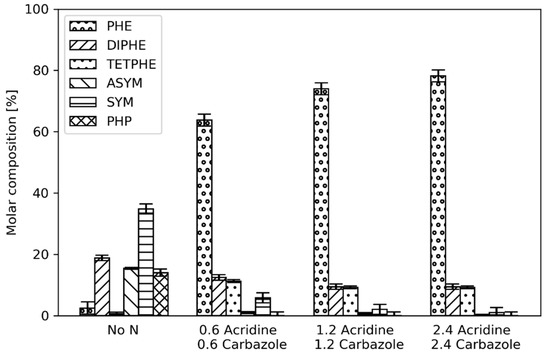 Phenanthrene product distribution in the presence of 2.4 mmol/dm3 acridine and the combination of acridine and carbazole (2.4 mmol/dm3 of each, i.e., 4.8 mmol/dm3 in total) at a reactor temperature of 300 °C.