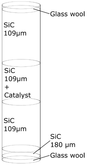Schematic of the reactor loading of different SiC sizes (average particle diameter) and catalyst. The bed section that contains catalyst bed is positioned in the middle of the reactor and is approximately 7 cm long.