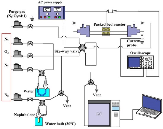 Compared with the process using plasma alone, the combination of DBD plasma and a catalyst further promotes the decomposition of gas-phase pollutants. Furthermore, it also addresses the problem of insufficient mineralization and reduces the generation of undesirable by-products. Nguyen et al. [21] used a Ag/α -Al2O3 catalyst coupled with DBD plasma to improve the conversion of soot simulant (naphthalene). The results showed that the combined use of the catalyst and plasma solved the problem of the poor removal of naphthalene at low operating temperatures. The plasma–catalyst completely decomposed the naphthalene at 350 °C with specific input energy of 90 J/L. Wu et al. [4] used a DBD reactor driven by a nanosecond pulse to oxidize naphthalene by combining plasma and a TiO2/diatomite catalyst. The study showed that the addition of the TiO2/diatomite catalyst effectively improved the conversion rate of naphthalene (up to 92%) and COx selectivity (up to 40%), and significantly reduced the formation of aerosols and secondary volatile organic compounds compared with the plasma-alone process. Therefore, it is necessary to investigate the treatment of naphthalene by combining plasma and catalysts.