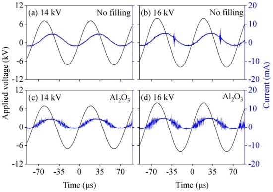 Figure 2 plots the voltage and current waveforms of the DBD reactor without a catalyst and filled with an Al2O3 catalyst. The driving frequency was fixed at 12.6 kHz. As shown in Figure 2, the discharge current filaments without a catalyst at 14 kV are almost invisible because the gas was not broken down in the plasma discharge region (Figure 2a). In comparison, the gas was broken down in the discharge gap, and the discharge current filaments can be clearly observed in the DBD reactor filled with Al2O3 at 14 kV (Figure 2c). This phenomenon shows that the addition of catalysts can decrease the breakdown voltage in the discharge gap. Furthermore, the discharge current filaments and uniformity apparently increased with the introduction of the catalyst at 16 kV (Figure 2b,d). These results occurred because Al2O3 has a higher dielectric constant than gas, and the introduction of the catalyst reduces the discharge gap of gas [28]. As such, an intense electric field is created in the areas of the contact points among the catalyst pellets, which decreases the breakdown voltage of the discharge gap and increases the number of micro-discharges [29]. As previously mentioned, the filling materials play a vital role in DBD. It is necessary to explore the influence of filling materials in plasma technology experiments.