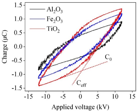 An additional capacitor providing much greater capacitance that that of the DBD reactor was used in series with the discharge circuit to accumulate the total charge during one AC half-cycle; its voltage can be plotted versus the discharge voltage in the Lissajous figure [31,33]. As shown in Figure 3, the closed curve area corresponds to the energy Ek consumed per cycle of the operating voltage [33,34]. Moreover, at the same input voltage, the Lissajous figure of the packing TiO2 has a larger area than the other catalysts, which means that TiO2 can further enhance the discharge power. From the slopes of the graph, it can be concluded that the TiO2 catalyst has greater effective capacitance Ceff [35]; that is, the TiO2 catalyst has a stronger charge-transfer ability than the other two metallic oxides.