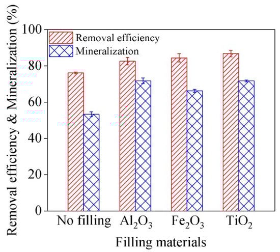 The removal efficiency and the mineralization of naphthalene under different filling materials are presented in Figure 4. It can be seen that the removal efficiency and the mineralization of naphthalene in the DBD reactor filled with Al2O3, Fe2O3, and TiO2 are higher than those without filling materials. When the applied voltage was 24 kV, the removal efficiency and the mineralization of naphthalene in the DBD reactor without filling materials were 76.1% and 53.4%, respectively. At an applied voltage of 24 kV, the removal efficiency of naphthalene in the DBD reactor filled with Al2O3, Fe2O3, and TiO2 was 82.6%, 84.5%, and 86.8%, respectively, and the mineralization of naphthalene in the DBD reactor filled with Al2O3, Fe2O3, and TiO2 was 71.8%, 66.3%, and 71.7% at 24 kV, respectively. This is because adding catalysts can increase the electric field intensity in the discharge gap via the discharge characteristics discussed in the former section [29], and promote the formation of more reactive oxygenated radicals [36]. In addition, the catalysts affect the removal efficiency and mineralization of naphthalene due to the different catalytic activity [36,37].