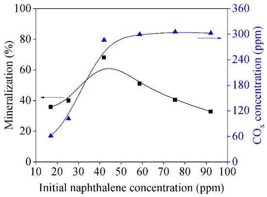 Effect of initial naphthalene concentration on the mineralization and COx concentration in a DBD reactor filled with Al2O3. (Discharge power: 55 W; driving frequency: 12.6 kHz; initial naphthalene concentration: 21.5 ppm; total gas flow rate: 500 mL/min; discharge gap: 3 mm).