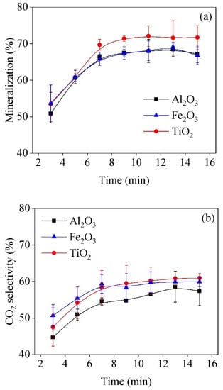 Effect of time on (a) the mineralization and (b) the CO2 selectivity in a DBD reactor filled with Al2O3, Fe2O3, and TiO2. (Discharge power: 55 W; driving frequency: 12.6 kHz; initial naphthalene concentration: 21.5 ppm; total gas flow rate: 500 mL/min; discharge gap: 3 mm).