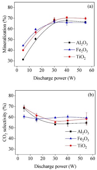 However, when the discharge power was not higher than 30 W, the CO2 selectivity decreased with the increase in discharge power in the DBD reactors filled with TiO2 and Al2O3 (Figure 8b). The increase in energy input intensifies the bombardment of the catalyst by the active particles, which results in further desorption of intermediate products on the catalyst [38]. Thus, the number of intermediate products increases in the reaction region, which reduces the number of active substances available for CO2 production and the selectivity of CO2 [40]. In contrast, the CO2 selectivity changed little in the DBD reactor filled with Fe2O3 (Figure 8b). This is because the Fe2O3 catalyst has more catalytic activity, and thus has a strong oxidation capacity for naphthalene; this was also confirmed by the mineralization in the DBD reactor filled with Fe2O3. The discharge wire covered the surface of the electrode and the micro-discharge quantity did not increase significantly when the discharge power increased to a certain value [48]. At this time, the generation of carbon oxides tended to be stable.