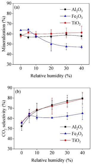 Effect of relative humidity on (a) the mineralization and (b) the CO2 selectivity in the DBD reactor filled with Al2O3, Fe2O3, and TiO2. (Discharge power: 55 W; driving frequency: 12.6 kHz; initial naphthalene concentration: 28 ppm; total gas flow rate: 500 mL/min; discharge gap: 3 mm).