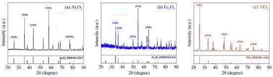 The three transition metal oxides (Al2O3, Fe2O3, and TiO2) were examined by XRD analysis. As presented in Figure 10, diffraction peaks are compared with the Inorganic Crystal Structure Database (ICSD) data to obtain the crystal parameters of the sample surface [54]. The diffraction peaks of the Al2O3 catalyst can be observed at 2θ of 25.6°, 35.2°, 43.4°, 57.6°, and 76.9°, corresponding to the (012), (104), (113), (202), (116), and (1010) crystal facets. The peaks of the Fe2O3 catalyst at 33.4°, 35.8°, 49.8°, 54.5°, and 64.4° correspond to (104), (110), (024), (116), and (300) crystal planes. The Ti2O catalyst shows diffraction angles (25.3°, 33.5°, 48.0°, 62.7°, and 75.0°) which correlate to the (101), (110), (200), (204), and (215) crystal planes [55].