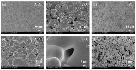 The scanning electron microscope (SEM) images of (a,d) Al2O3 catalyst, (b,e) Fe2O3 catalyst, and (c,f) TiO2 catalyst.
