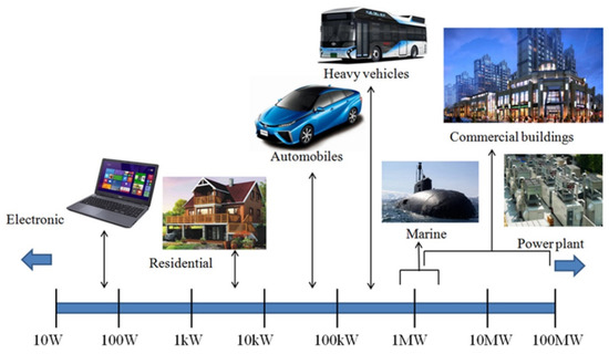 Depending on the desired power output scale, FCs can be employed in various applications such as electronics, residential, automobiles, heavy vehicles, commercial buildings, and marine and power operations, as depicted in Figure 1. In general, an FC consists of three fundamental functioning parts. The fuel (e.g., hydrogen, ethanol, methanol, methane) is oxidized at an electropositive anode, i.e., a fuel electrode, an electronegative cathode that undergoes a reduction reaction (to O2, air, and other substances). The current is transferred between the two electrodes by ions in an electrolyte put between them.