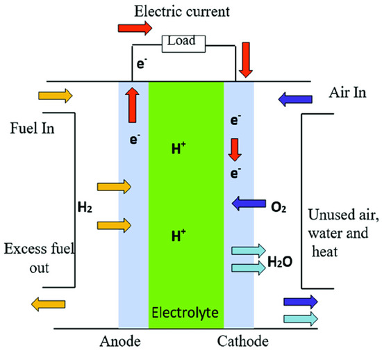 On the anode of the FC, the hydrogen is ionized into electrons and protons as shown in Figure 2. The electrons then travel to the cathode, where oxygen is reduced. The protons permeate the electrolyte to join the oxygen species on the cathode, resulting in just water as an end product [18]. The hydrogen fuel is processed at the anode, where the electrons are separated from the proton on the surface of the Pt-based catalyst. On the cathode side, the precious metal combines with protons and electrons with oxygen to produce water. This process results in the generation of electricity, thermal power, and water. The net electrochemical reaction at the electrode is exothermic, which gives a positive cell potential as output. The electrochemical reaction that occurs at the electrode is summarized below: