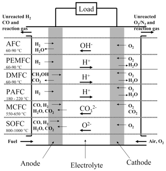 FC is an electrochemical device that could transform chemical energy into electrical energy in one route, providing several advantages [8]. As a result of the static nature of FC, there is no noise or vibration throughout the conversion process. As long as both the fuel and the oxidant are accessible, an FC is an energy conversion device that constantly transforms chemical energy in fuel into electrical energy. It outperforms standard combustion-based methods used in vital industries including home electricity, electronics, passenger vehicles, power plants, and military applications. With a 60% or greater electrical energy conversion efficiency and fewer emissions, FCs are more efficient than combustion engines. In terms of renewable energy, the FC is a viable solution. Since the early 1800s, FCs have been researched and developed. FCs are divided into two types based on the electrolyte employed, such as alkaline and acidic FCs, and the working temperature, i.e., low- and high-temperature FCs [9,10]. Every kind has unique characteristics that are required for its usage. Alkaline FC (AFC) [11], Proton exchange membrane FC (PEMFC) [12], direct methanol [13] FC (DMFC) [13], phosphoric acid FC (PAFC) [14], melting carbonate FC (MCFC) [15], and solid oxide FC (SOFC) [16] are devices that use electrochemical processes to turn the chemical energy of the fuel directly into electrical energy using fuels—viz. natural gas, hydrogen, methanol, etc.—and oxidants such as O2, air, H2O2, etc.