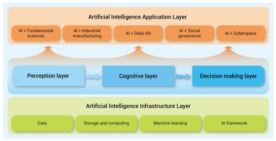 Figure 5 depicts the general framework of artificial intelligence. Perceptual intelligence, cognitive intelligence, and decision-making intelligence are all part of the AI development process. Perceptual intelligence refers to a machine’s core human-like skills such as vision, hearing, touch, and so on. Cognitive intelligence is the capacity to think, infer, and acquire information at a higher level. It is based on cognitive science, brain science, and brain-like intelligence and aims to provide robots with human-like reasoning and cognitive abilities. Once a machine possesses perception and cognition abilities, it is frequently expected to make optimum judgments in the same way that humans do, improving people’s lives, industrial manufacturing, etc. To make optimum judgments, decision intelligence involves the use of applied data science, social science, decision theory, and management science. The infrastructural layer of AI, supported by data, storage, and processing capacity, ML algorithms, and AI frameworks, is necessary to realize the aim of perceptual, cognitive, and decision-making intelligence. It can then understand the internal rules of data for supporting and developing AI applications by training models. AI’s application layer is expanding and becoming more thoroughly interwoven with basic sciences, industrial production, human life, social governance, and cyberspace, significantly influencing our jobs and leisure [69,72,73,74].