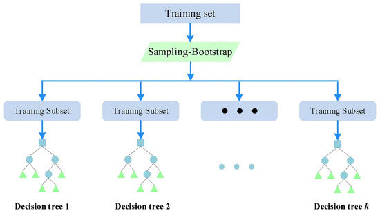The Random Forest approach combines the bagging algorithm with a multilevel decision tree, which is frequently used to select features in the development workflow of data-driven models. The rationale is that random forests’ tree-based methods are essentially ranked by how efficient they increase node purity. Figure 8 depicts the random forest formation process [107].