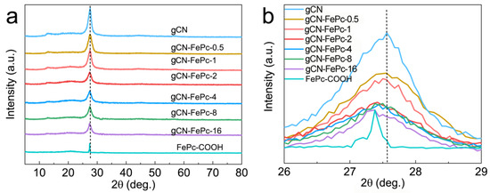 Figure 2a displays XRD patterns of samples. The pattern of the prepared gCN implies that it demonstrated a good purity without any secondary or impurity phase, and the two respective peaks centered at 13.3° (100) and 27.6° (002) are attributed to the in-plane structural packing of tri-s-triazine motifs and repeated inter-planar stacking of conjugated aromatic systems, respectively [39,40,41]. After FePc was introduced into the gCN skeleton, these two diffractions remained in the gCN-FePc-X samples, but the crystallinity gradually decreased with the increase in the FePc content due to the gradual increase in full width at half maximum (FWHM). That should be ascribed to the partial destruction of periodic arrangement of tri-s-triazine units. The pure FePc-COOH exhibited an obvious diffraction at ~27.4° [32,42]. We can find from the enlarged XRD patterns within the range of 26–29° (Figure 2b) that the (002) peak of graphite-like structure in gCN-FePc-X samples gradually shifts to low 2θ value with the increase in the FePc content, which potentially originated from the disturbance of the graphitic structure caused by modifying FePc into the CN framework, thus enlarging the interlayer distance.