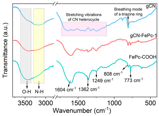 Functional groups on photocatalysts were characterized through FTIR technology, and the results are illustrated in Figure 3. Broad absorption band at ~3450 cm−1 was related to the stretching vibration of O–H from adsorption water and that at ~3200 cm−1 was contributed to the N–H vibration of the terminal amino group on gCN. Compared to the gCN and FePc-COOH, the change in the relative intensity of such absorption in the gCN-FePc-1 suggests the well hybridization of gCN and FePc. A series of characteristic absorption at 1800–1200 cm−1 was assigned to the typical stretching vibrations of C–N heterocycles and at 810 cm−1 to the breathing mode of s-triazine ring [43,44,45]. The spectrum of FePc-COOH showed that the strong absorption band at 1604 cm−1 corresponded to the stretching vibration of –COOH group and the C–N heterocyclic ring; the absorption at 1362 cm−1 and 1249 cm−1 to the C=C vibrations of aromatic ring and the peaks at 808 cm−1 and 773 cm−1 originated from the skeleton vibration of phthalocyanine, respectively [31,42]. These characteristic absorption of FePc were observed in the gCN-FePc-1 sample, implying the successful formation of hybrid photocatalyst.