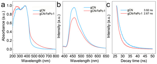 UV-vis DRS (a), steady-state PL spectra (b), and time-resolved PL spectra (c) of gCN and gCN-FePc-1.