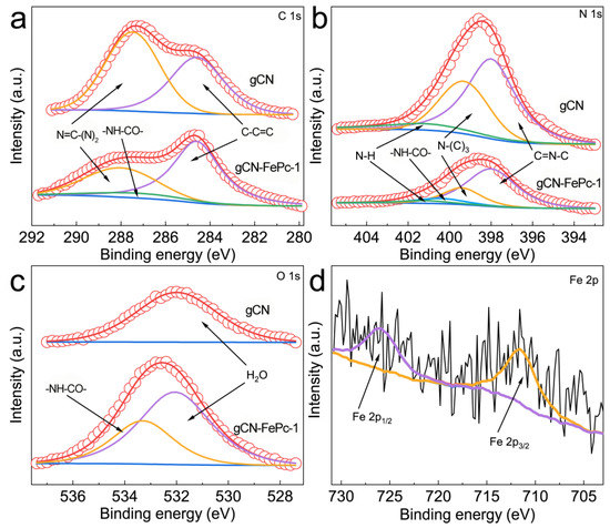 XPS spectra of gCN and gCN-FePc-1: C 1s (a), N 1s (b), O 1s (c), and Fe 2p (d).