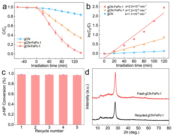 Photocatalytic reduction in p-NP over different photocatalysts under visible light irradiation (a); the corresponding pseudo-first-order kinetic curves and the apparent rate constants (b); cycle stability test of gCN-FePc-1 (c); XRD patterns (d) of the fresh gCN-FePc-1 and the recycled gCN-FePc-1. The experimental data in Figure 7 (a–c) are based on three repeated experiments.