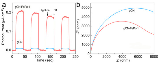 Semiconductors with intrinsic bandgap structures are known to possess reliable photoelectric conversion properties. In order to demonstrate the enhanced photoelectric performance after the addition of FePc into CN skeleton, the transient photocurrent response and EIS were measured. As presented in Figure 8a, the gCN-FePc-1 exhibited much higher photocurrent intensity than the gCN, indicating that much more photoexcited electron-hole pairs were generated and separated in the gCN-FePc-1 [24,59]. The EIS spectrum in Figure 8b shows that the gCN-FePc-1 possessed a smaller arc radius than gCN, representing a lower resistance and a higher charge transfer ability in the gCN-FePc-1 than the gCN [19,60].