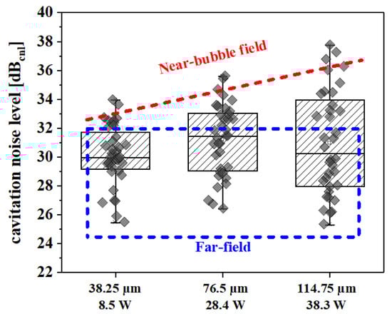 Measured cavitation noise level in the sonophotocatalytic reaction zone beneath the UV−LED system.