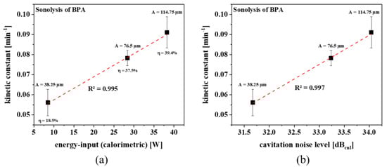 The reactive cavitation occurs in the visualized chemiluminescence areas and corresponds to the amount of generated hydroxyl radicals, which can be confirmed by the correlation with kinetic degradation constants (Figure 3). The sonolytic degradation of bisphenol A can be correlated in a linear manner (R2 = 0.995) to the ultrasonic energy input, considering the energy-conversion efficiency (Figure 3a). The kinetic constants of the sonolysis of bisphenol A are calculated in the range of kS = 0.056–0.091 min−1. Furthermore, it was found that the cavitation noise level also shows a linear correlation to the kinetic constants (Figure 3b).