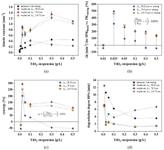 the efficiency of the sonophotocatalysis is compared to the photocatalysis regarding to the highest degradation rates for the low- and high-suspension range with the TiO2 dosages of 0.025 g/L and 0.3 g/L (Figure 6a,b).