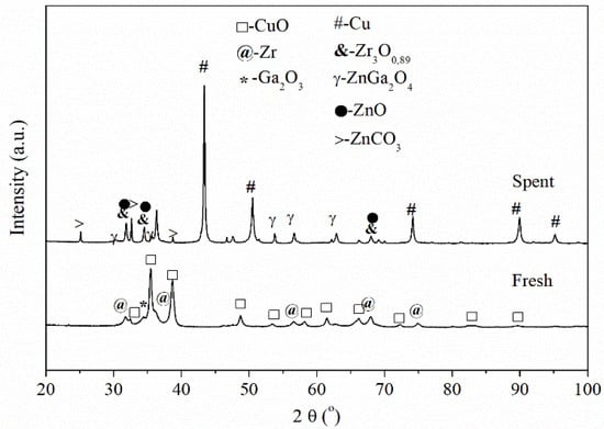 The structures of the fresh and spent Cu/Zn/Zr/Ga catalyst were compared using XRD (Figure 1).