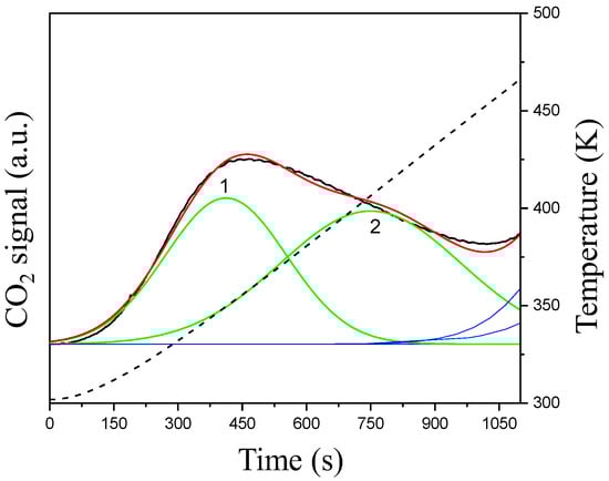 The observed increase in the CO2 line above ca. 470 K is related to the desorption of CO2 that originates from the atmosphere [45,46]. This CO2 was not removed upon sample activation prior to TPD because the temperature was not high enough. The contribution of atmospheric CO2 in the TPD profile was marked with a blue line (Figure 2) and was not taken into consideration for the total basicity calculation. Additionally, the ratio of CO2 desorbing in the temperature range 323–343 K (Totdes) to adsorbed CO2 via pulses (Totads.) is close to one (Table 3). This also shows that CO2 desorbing at higher temperatures is atmospheric.