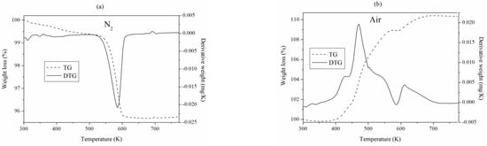Thermogravimetric analysis of the spent Cu/Zn/Zr/Ga catalyst performed using a nitrogen and air atmosphere is presented in Figure 3a,b.
