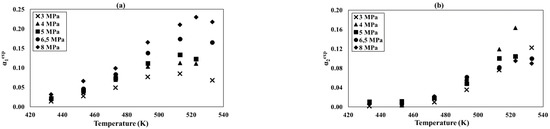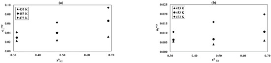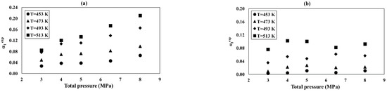 Figure 5a,b shows the pressure relationships of the conversion degrees α1exp and α2exp for different temperatures. The pressure dependences of α1exp and α2exp are smaller than the effect of temperature (Figure 4a,b and Figure 5a,b). The conversion degree α1exp increases with the pressure by more than 50%, while α2exp is almost constant for all tested temperatures. The differences occur only within temperatures of 453–513 K and reach up to 50% (Figure 5b).