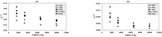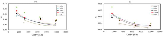Figure 6a,b shows the GHSV relationships of the conversion degrees α1exp and α2exp for different pressures. For both, reactions α1exp and α2exp decrease with rising GHSV. This relationship appears to be stronger with higher pressure. Especially for the GHSV range 1660–3310 1/h, a decrease from about 5% to about 30% (α2exp for 8 MPa) occurs.