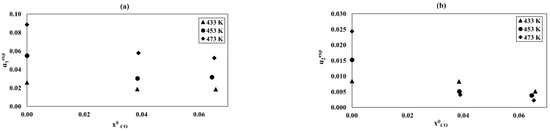 Figure 9a,b shows the dependence of the conversion degrees α1exp and α2exp on the initial carbon monoxide concentration for temperatures of 433, 453, and 473 K. The effect of the initial molar fraction of carbon monoxide was studied at constant initial concentrations of H2 = 0.68 and = 0.22.