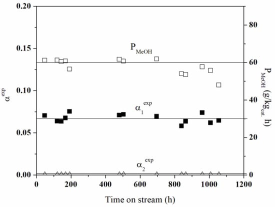 The catalyst should exhibit stable behaviour during operation. Its activity should not change; thus, it should be resistant to various factors (coking, sintering). In order to examine the stability, the dependence of α1exp and α2exp and the productivity as a function of time on stream were determined. The stability was checked for 1056 h by carrying out weekly measurements for identical process parameters: at atemperature of 453 K andpressure of 8 MPa, at a constant flow rate of 100 mL/min (GHSV = 3300 1/h) for a reaction mixture of 0.69 H2 and 0.21 CO2 (Figure 10). Up to 700 h of the measurements, small (within the measurement error) deviations of α1exp and α2exp values (marked as points in Figure 10) from their average values (lines in Figure 10) were observed for both reactions. After about 700 hof stable work, the beginning of a downward trend in productivity appears so that, for 1000 h, the decrease in productivity reaches about 20%. The part of CO2 can be bonded to ZnO, leading to the formation forming ZnCO3 (Figure 1 and Figure 3a,b). The CO2 adsorption active centres were blocked, resulting in a decrease in productivity. The formation of ZnCO3 is attributed to the prolonged residence of the catalyst at elevated pressure (8 MPa) [50]. In a study by Asha-Kurlander et al. [51] on methanol synthesis from H2 and CO2, ZnCO3 was found to be formed in an acidic environment, which is responsible for the partial dissolution of ZnO in a mixture of H2O and CO2.
