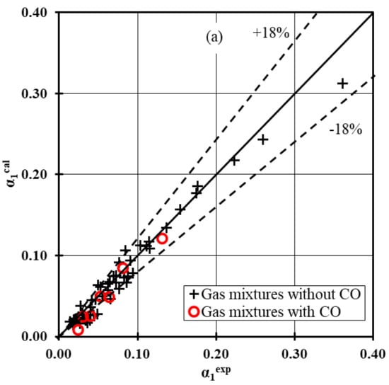 Figure 11a,b shows αcal as a function of αexp for 59 experimental data.