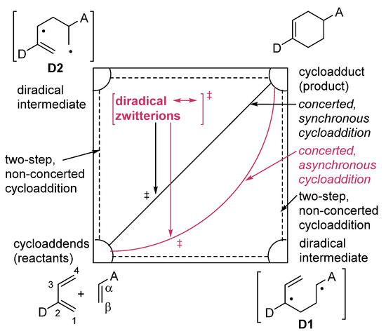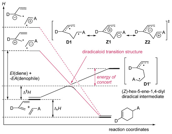 Thermochemical data tell us that the preferred diradical intermediate is the one for which the substituents stabilize the radicals the best, and this implies, as a rule, that this diradical results from combining the least substituted centers of the diene and dienophile. In other words, the most stable isomeric diradical intermediate is the one that has generated the strongest bond between the two reactants (for instance D1 or D1’, Figure 3). Since many Diels−Alder reactions have measured activation enthalpies Δ‡H that are lower than the enthalpy difference ΔrH° between the diradical and the cycloaddends, the difference ΔrH° − Δ‡H can be taken as Doering’s energy of concert (Figure 3). The transition state of such reactions can be readily described in terms of frontier molecular orbital interaction theory [77,78]. An alternative valence-bond representation is that transition structures can be represented by diradicaloids, i.e., diradicals that exchange electron between the two radical entities. Within the valence bond theory, this electron exchange can be represented by a (Z)-diradical and one or two zwitterions, as shown in Figure 3 with D1