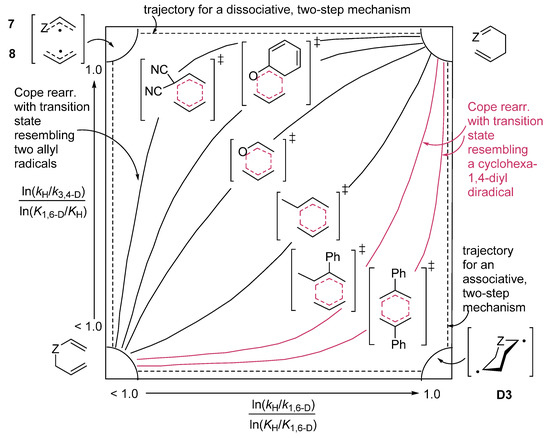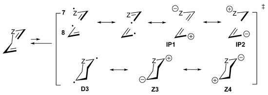 Gajewski and Conrad mapped out the positions of transition states on such diagrams through their measurements of secondary deuterium kinetic isotope effects and comparisons to equilibrium isotope effects [79]. In the concerted one-step mechanisms, the bond forming process assists the bond breaking process. Their transition states can be represented by transition structures belonging to two types of diradicaloids (Figure 5). The two allyl radicals 7 + 8 exchange an electron, forming ion-pairs IP1 or/and IP2. On its side, diradical D3 is stabilized by electron-exchange leading to zwitterions Z3 or/and Z4. Substituent effects on the relative stability of radicals, cations, and anions allow one to predict the reactivity of these concerted reactions. This model explains substituent effects on rates and the accelerating effects of catalysts. For instance, any additive that can stabilize one or the other of the charge-transferred limiting structures will catalyze the (3,3)-sigmatropic rearrangement.