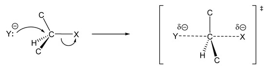 Shaik and Pross, as well as others, have described the SN2 reaction transition states in terms of valence bond theory [91,92,93,94,95,96,97,98]. The transition structure of a SN2 reaction (Figure 7) engaging a negatively charged nucleophile can be represented by the limiting structures: