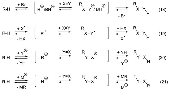 In classical chemistry, direct hydrocarbations of unsaturated compounds X=Y are non-concerted processes. If R is an allyl moiety, a concerted ene-reaction can occur (e.g., CH2=CH-CH2R’ + X=Y → H-X-Y-CH2-CH=CHR’). If the catalyst is a base B:, it deprotonates R-H forming the conjugate base R- as an intermediate, which then adds to the alkene (or alkyne), generating an anionic adduct. The latter is then quenched by the conjugate acid BH+ of the basic catalyst (nucleophilic addition (18)) or by R–H, realizing a chain process. Concurrently, the anionic adduct intermediate can add to another alkene (alkyne) and start the polymerization of the latter (anionic polymerization).