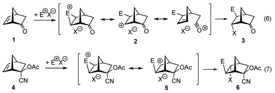 The thermochemical data presented above demonstrate that a carbonyl group is a π-withdrawing and a σ-donating group [36,37,38]. This explains the regioselectivity of the electrophilic additions (6) to the alkene moiety of bicyclo[2.2.1]hept-5-en-2-one (1) to be the opposite of those of its synthetic precursors, the corresponding cyanoacetate (4) (reactions (7), Scheme 1) [39,40,41]. Quantum mechanical calculations find that the 6-oxobicyclo[2.2.1]hept-2-yl (2, E=H) cation is much more stable than its 5-oxo isomer [42,43]. The former carbocation is stabilized by n(CO)/σ(C(1)-C(6))/π(C(6)) hyperconjugation, what is not possible in the latter isomer. This type of interaction allows keto [44] and ester groups [45] to migrate more quickly in Wagner–Meerwein and pinacolic rearrangements than alkyl and phenyl groups.