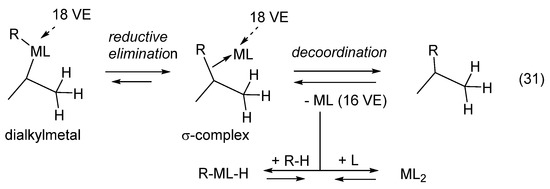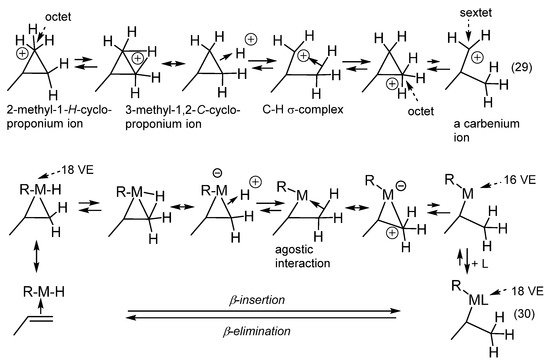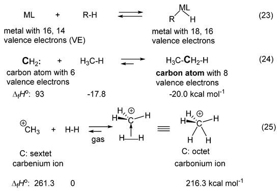Unsaturated transition metal complexes (with 16 or fewer valence electrons) are able to add across the σ(C-H) of R-H and form adducts of type R-[M]-H (can be an equilibrium of geometrical isomers) in which a σ(M-R) and a σ(M-H) bond are formed. In this adduct, the metal atom has gained two more valence electrons (VE) [143,144,145,146,147]. This is called an oxidative addition [148]. The oxidative addition (23) of a transition metal complex ML to a C-H bond is modeled in organic chemistry with the insertion of a carbene into a single C-H bond to give an alkane. For instance, methane adds to methylene carbene (reaction (24)), giving ethane (ΔfH° = standard heat of formation in the gas phase). The carbene has a carbon atom with a sextet of VE, meaning that it is unsaturated, whereas the carbon center in the product (alkane) has an octet of VE, meaning it is saturated. Another comparison is the reaction of a methyl cation with methane that equilibrates with an ethonium ion (C2H7+ = protonated ethane) in the gas phase [149]. Dihydrogen (H2) reacts with methyl cations (which has a sextet of VE on its carbon atom), giving a methonium ion (CH5+ = protonated methane, carbon atom with an octet of VE) as shown (Scheme 5) with Equilibrium (25) [150,151,152,153,154].