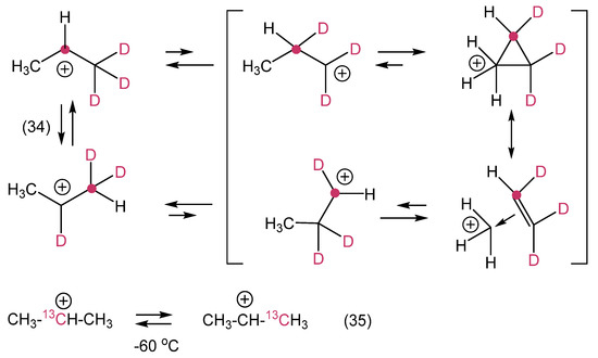- Saunders, M.; Hagen, E.L. Rearrangement reactions of secondary carbonium Ions. Isopropyl cation. J. Am. Chem. Soc. 1968, 90, 6881–6882. [Google Scholar] [CrossRef]