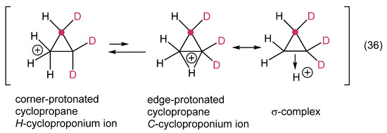 - Saunders, M.; Vogel, P.; Hagen, E.L.; Rosenfeld, J. Evidence for protonated cyclopropane intermediates from studies of stable solutions of carbonium ions. Acc. Chem. Res. 1973, 6, 53–59. [Google Scholar] [CrossRef]