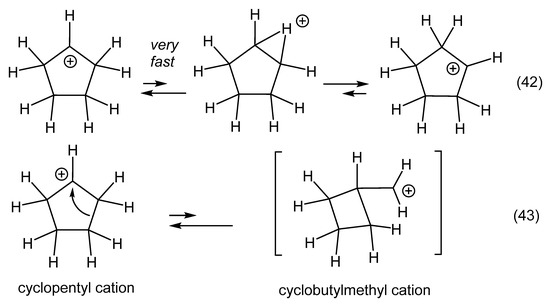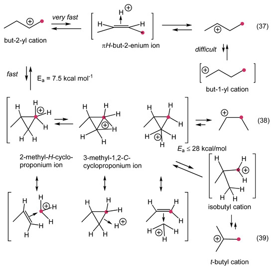 - Saunders, M.; Hagen, E.L.; Rosenfeld, J. Rearrangement reactions of secondary carbonium ions. Protonated cyclopropane intermediates formed from sec-butyl cation. J. Am. Chem. Soc. 1968, 90, 6882–6884. [Google Scholar] [CrossRef]