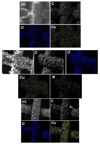 Once the pristine Cu mesh was modified by electrochemical anodization in the presence of carboxylate ligands, the reddish brown color of Cu mesh was noticeably changed to a color of dark gray, as shown in Figure 1b, suggesting that the Cu meshes had been modified and deposited with certain substances. Figure 2 further reveals microscopic morphologies of these modified Cu meshes. Specifically, Figure 2a shows the electrochemically synthesized Cu mesh in the presence of BDC, and presents how the Cu wires were fully covered by innumerable fluffy needles. Figure 2b unveils that the needles exhibited a thickness of ~200 nm and a length of a few micrometers. These images also demonstrate that the single-step electrochemical anodization of Cu mesh in the presence of BDC successfully grew nanostructures on Cu meshes. Elemental analysis of the BDC-modified Cu mesh presents how signals of C, O and Cu (Figure 3a) were uniformly distributed all over the Cu mesh, indicating that these resulting nanostructures were evenly grown on the Cu mesh. The abundant signals of C and O elements also validate that the BDC ligand shall be incorporated and comprised in these nanostructures.